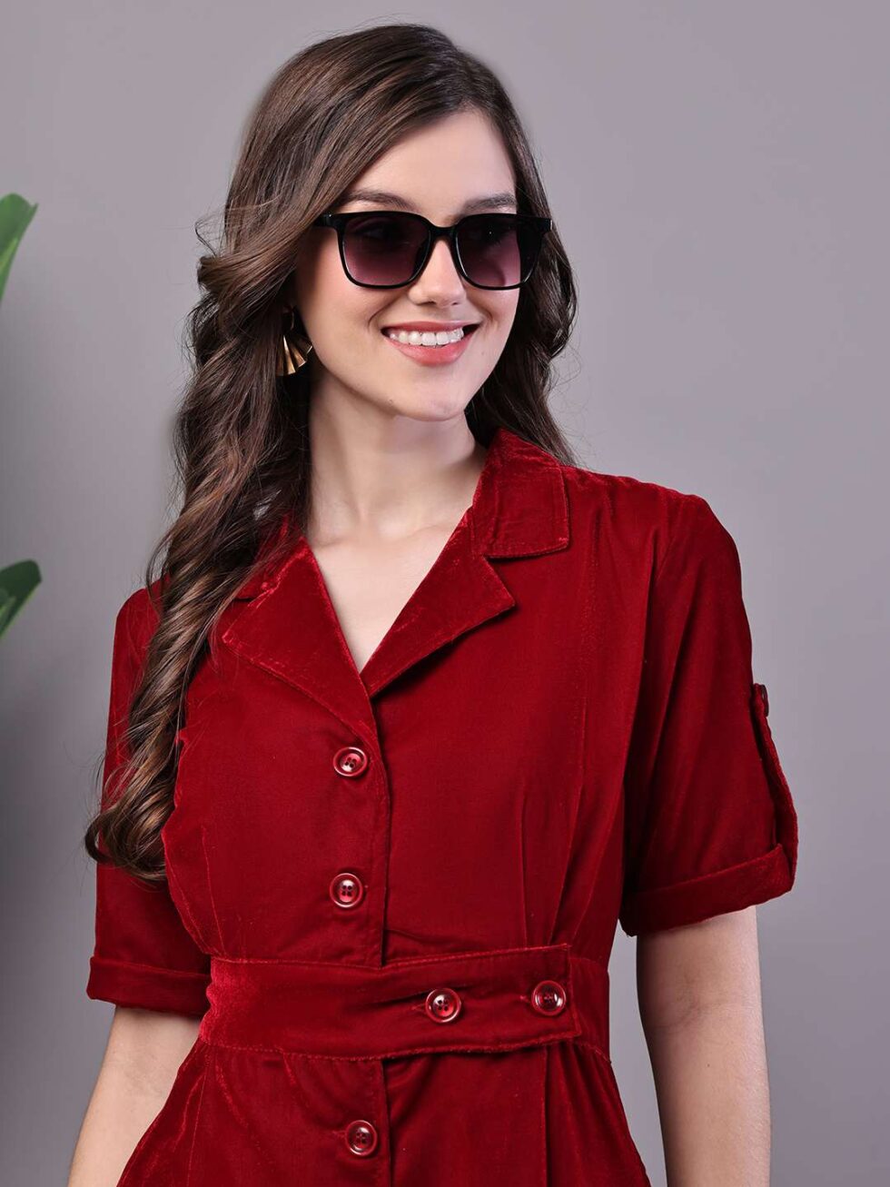 Women’s Maroon Velvet Solid Printed Shirt Midi Dress with Belt